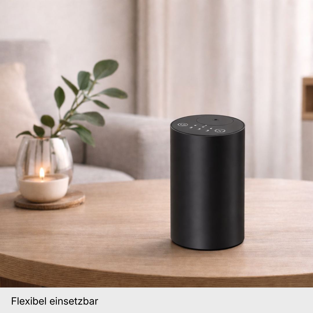 Der Diffuser kann kabellos über Akku oder im Dauerbetrieb via USB-C verwendet werden und eignet sich für Wohn-, Schlaf- und Arbeitsräume. Kippschutz und automatische Abschaltung sorgen für eine sichere Anwendung.